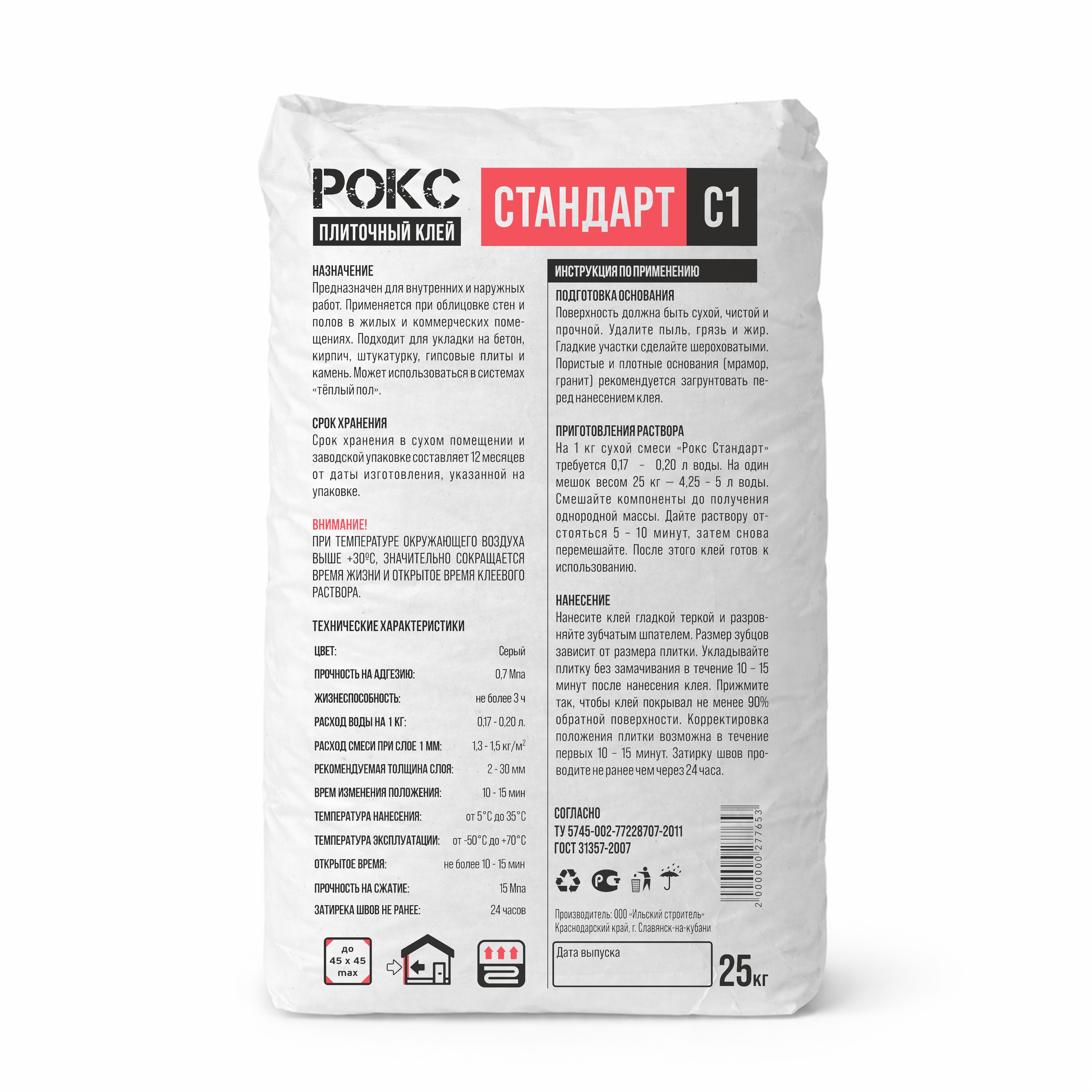 На 1 кг сухой смеси «Рокс Стандарт» требуется 0,17 – 0,20 л воды. На один мешок весом 25 кг — 4,25–5 л воды. Смешайте компоненты до получения однородной массы. Дайте раствору отстояться 5 – 10 минут, затем снова перемешайте. После этого клей готов к использованию